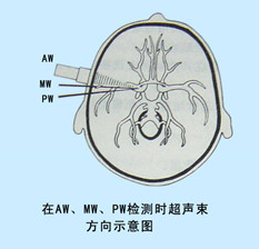 超聲束經顳骨鱗部進入顱內的通道。在顴弓上方眼眶外緣與耳翼之間分前窗(AW) 、中窗(MW) 、后窗(PW)三個窗位。中窗是常用的窗口,而老年人常用后窗。可檢測到:大腦前動脈、大腦中動脈、大腦后動脈、前交通動脈、后交通動脈、頸內動脈終末段及基底動脈分叉處。用2MHz 脈沖多普勒探頭,檢測深度: 50~70mm 左右,體位: 受檢者仰臥位,頭置正位。