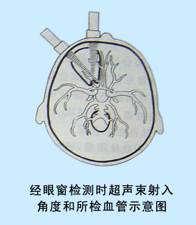 超聲束經視神經孔進入顱內的通道。可檢測到:眼動脈、頸內動脈虹吸段,對側大腦中動脈和大腦前動脈,同側大腦后動脈。用2MHz脈沖多普勒探頭。篩查深度: 眼動脈35~ 50mm; 虹吸50~60mm,體位: 仰臥,頭置正位,閉合雙目,有足夠耦合劑,無需探頭加壓,接觸好即可。