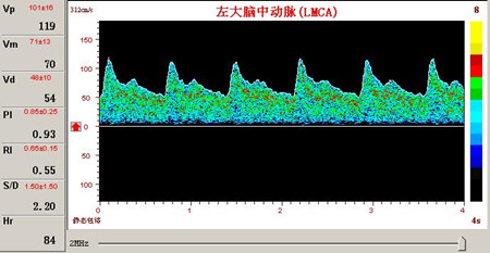 超聲經顱多普勒血流分析儀大腦中動脈血流速度不對稱頻譜圖